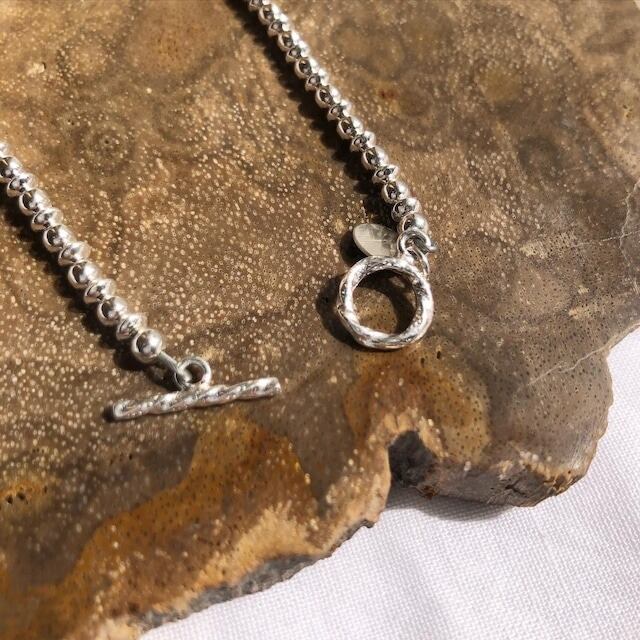 大きなシルバーのバングルとの相性も良く、お手持ちのアクセサリーとも合わせられます。